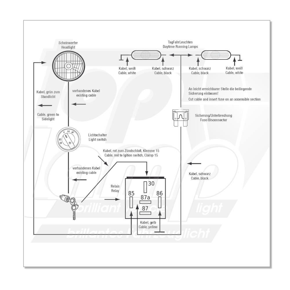 Bitte schließen Sie die LED-Tagfahrleuchten exakt wie auf untenstehender Zeichnung angegeben an.